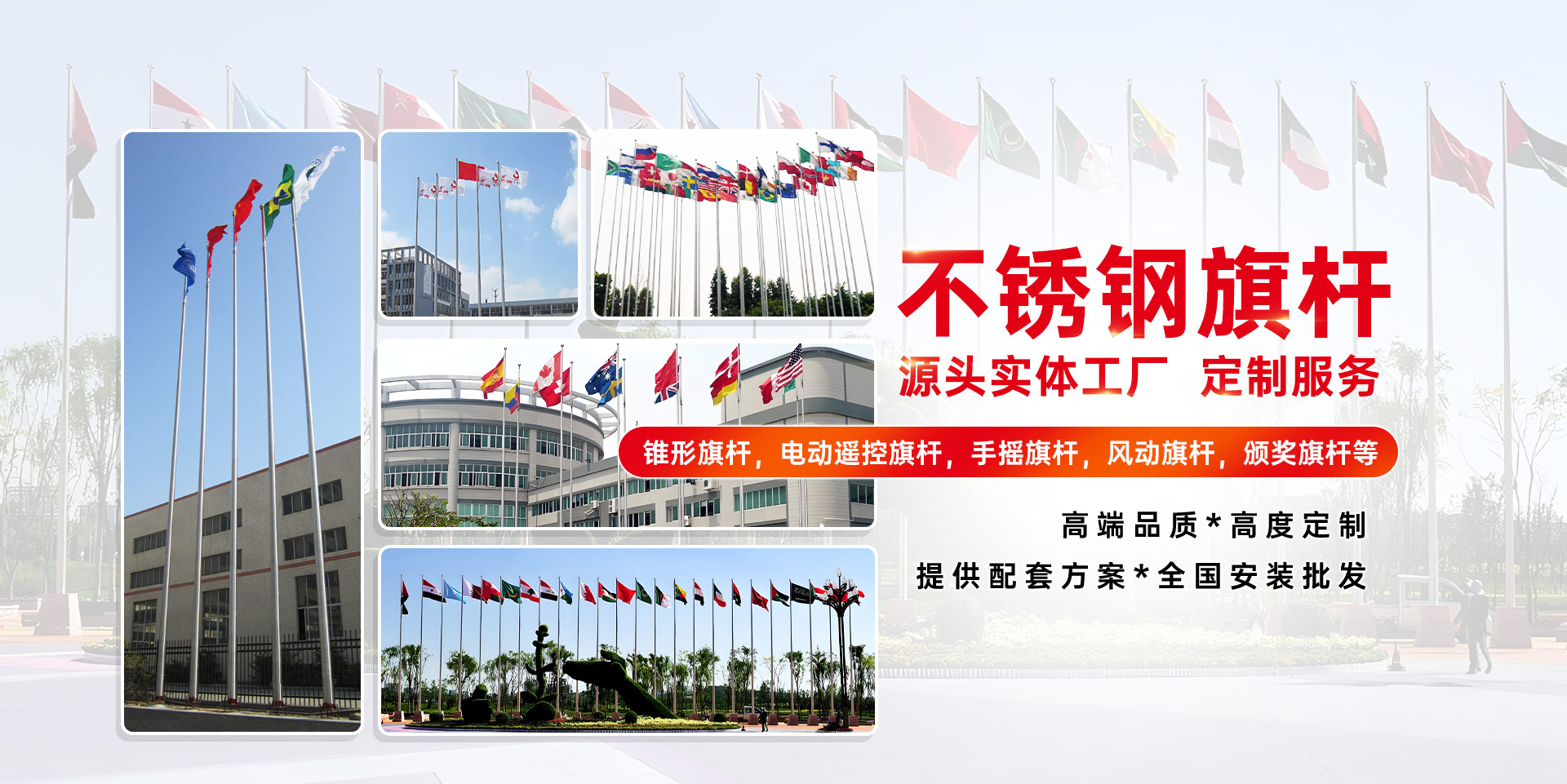 公司主要生產安裝及批發的產品:不銹鋼旗桿、錐形旗桿、電動旗桿、手動旗桿、風動旗桿,國歌音樂同步旗桿,水平頒獎旗桿、升降柱、電動升降柱、路障機等系列產品。